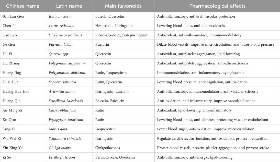 Natural products used in TCM have shown significant anti-atherosclerotic activities in preclinical studies by simultaneously counteracting the aforementioned pathogenic mechanisms (Si and Lai, 2024). A prominent example is the class of flavonoids, which includes metabolites from Scutellaria baicalensis (Huang Qin; e.g., baicalin, baicalein), Pueraria lobata (Ge Gen; puerarin), Ginkgo biloba (Yin Xing Ye; quercetin, ginkgoflavones), Morus alba (Sang Ye; isoquercitrin, morusin), Citrus reticulata (Chen Pi; hesperetin, naringenin), Perilla frutescens (Zi Su Ye; perilloflavone, quercetin), Glycyrrhiza uralensis (Gan Cao; licochalcone A, isoliquiritigenin), and Sophora japonica (Huai Hua; rutin, quercetin), etc. Flavonoids prevent the progression of atherosclerosis by scavenging free radicals and activating antioxidant defenses (Nrf2-mediated), thereby reducing LDL oxidation and endothelial damage. They also inhibit the inflammatory component of plaque formation; in vitro studies demonstrate that flavonoids suppress NF-κB signaling and lower pro-inflammatory mediator levels in vascular cells, which in turn mitigates leukocyte adhesion and foam-cell formation (Zhang et al., 2021; Ding et al., 2024; Wang Y. M. et al., 2024). In addition, flavonoid-rich botanical drugs have been noted to improve lipid profiles. For instance, puerarin (from P. lobata) and rutin (from S. japonica) can upregulate hepatic LDL receptors and promote cholesterol clearance, leading to reduced circulating LDL levels. In some animal studies, increased flavonoid intake has been inversely associated with the development of atherosclerosis (Bondonno et al., 2024).