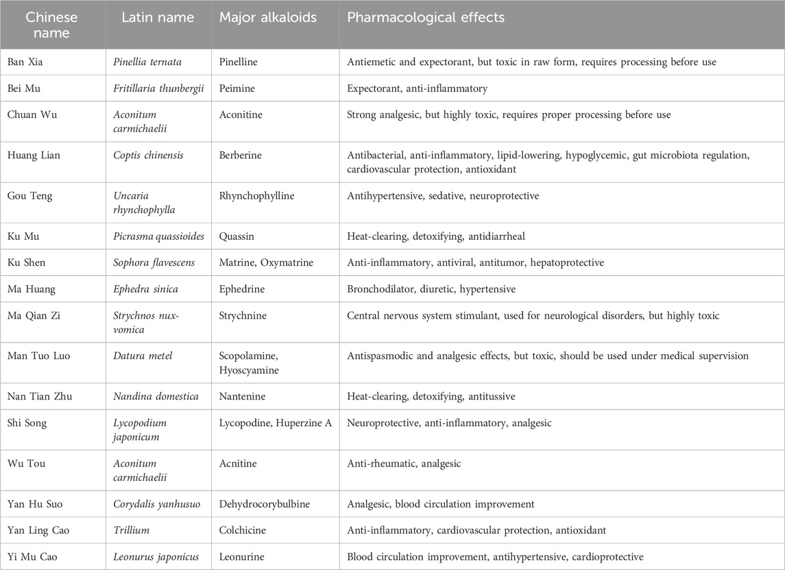 Table 2. Representative alkaloids and their main sources and pharmacological effects of traditional Chinese medicine.