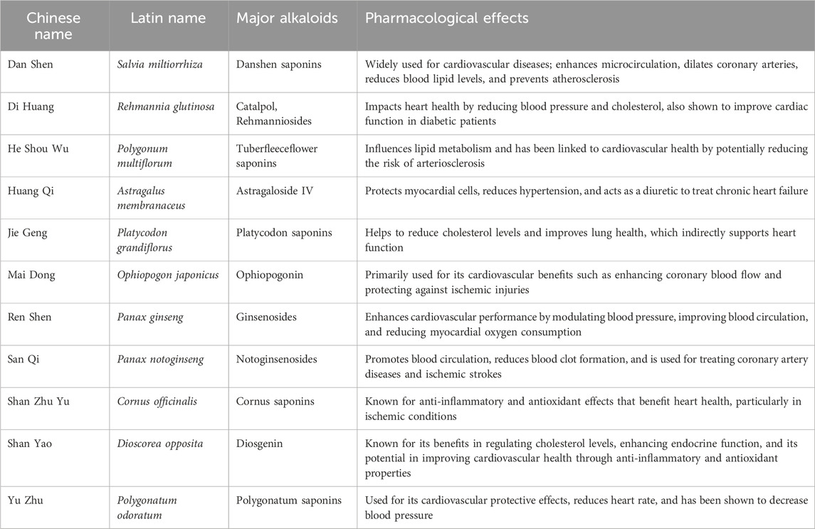 Many foods have the function of promoting health, so the concept of “dietotherapy” or “medicinal food” is widely known, and this phenomenon is called “continuum of food and medicine” by academic circles; Together with traditional Chinese medicine (TCM) and its natural drug metabolites as potential resources for new CVD therapy, it is attracting increasing academic attention (Chen, 2023; Yao et al., 2023). TCM-derived natural products—isolated from botanical drugs (medicinal plants) long used in TCM practice—offer multi-target and multi-pathway mechanisms that could holistically address the complex pathophysiology of CVDs. Many such metabolites (e.g., flavonoids from Scutellaria baicalensis and citrus peels, saponins from Panax ginseng, Astragalus membranaceus and Dioscorea nipponica Makino, alkaloids like berberine from Coptis chinensis) have demonstrated cardioprotective effects with relatively favorable safety profiles. These phytochemicals can concurrently modulate oxidative stress, inflammation, endothelial function, lipid metabolism, and myocardial remodeling, thereby intervening at multiple disease nodes (Tang et al., 2015a; Fan et al., 2016; Feng et al., 2017; Ou-Yang et al., 2018; Zeng et al., 2019; Orgah et al., 2020; Shao et al., 2020; Sadoughi et al., 2021; Jin et al., 2024; Shi et al., 2024). TCM treatments involve multiple components and targets acting concurrently, making their mechanisms difficult to fully elucidate. Furthermore, comprehensive reviews focusing on the active compounds from TCM and their cardiovascular mechanisms remain limited.
