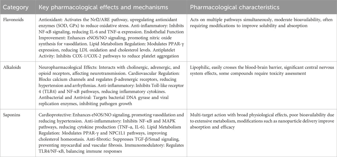Flavonoids, alkaloids, and saponins impact cardiovascular pharmacology, offering anti-inflammatory, antioxidant, anti-fibrotic effects, improved endothelial function, and lipid metabolism regulation. They influence apoptosis, autophagy, and ferroptosis, targeting conditions like ischemia-reperfusion injury, atherosclerosis, heart failure, hypertension, and hyperlipidemia through pathways NF-kb, Nrf2, TGF-β, MAPK, eNOS, PPAR, and AMPK.