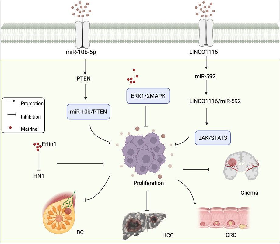 Figure 1. Mechanism of matrine inhibiting tumor cell Proliferation. Matrine regulates the miR-10b/PTEN and ERK1/2 MAPK pathways to suppress proliferation in various cancer types including BC and HCC. It also inhibits HN1 expression via Erlin1. In glioma and CRC, matrine modulates the LINC01116/miR-592 axis and suppresses the JAK/STAT3 signaling pathway. BC, breast cancer; HCC, hepatocellular carcinoma; CRC, colorectal cancer. Arrows indicate activation, blunt lines indicate inhibition, and red dots represent matrine.