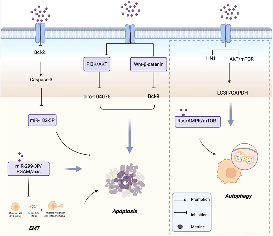 Figure 2. Mechanism of Matrine inducing tumor cell apoptosis and Autophagy. It activates caspase-3 by inhibiting Bcl-2, modulates the PI3K/AKT and Wnt/β-catenin pathways, and regulates circ-104075, Bcl-9, miR-182-5P, and the miR-299-3P/PGAM axis to promote apoptosis and suppress EMT. Meanwhile, matrine triggers autophagy by downregulating HN1 and inhibiting AKT/mTOR signaling via the ROS/AMPK/mTOR pathway. Arrows indicate promotion; blunt lines indicate inhibition; purple dots represent matrine.