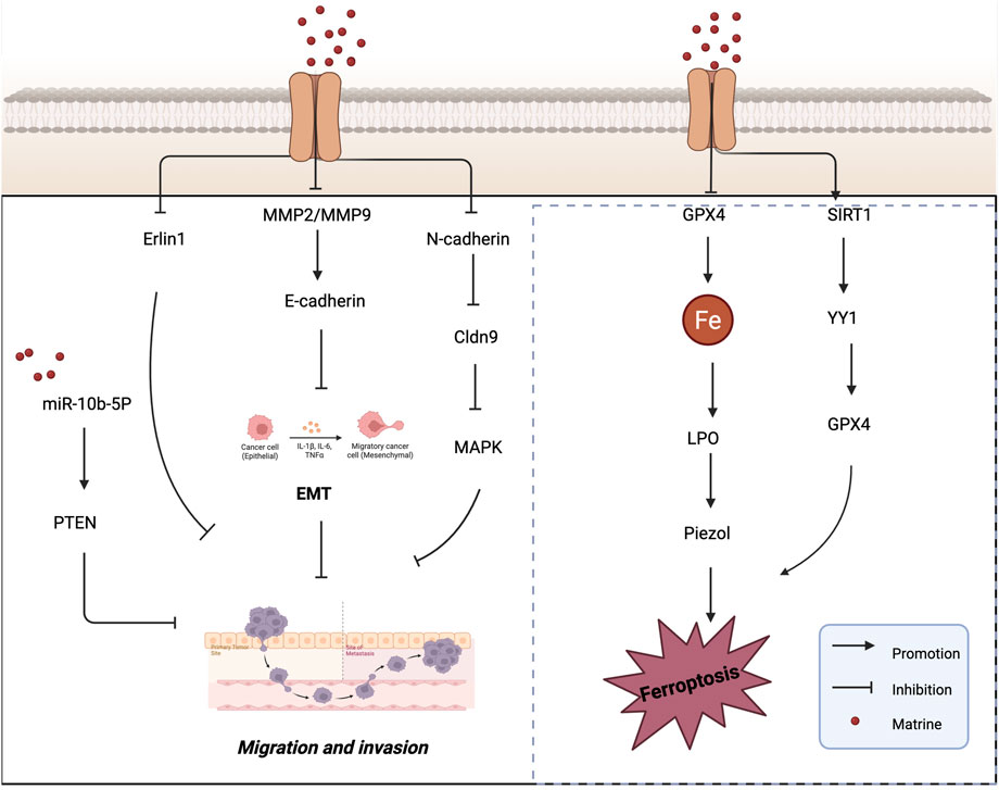 Figure 3. Mechanisms by which matrine inhibits tumor cell migration and invasion and induces ferroptosis. Matrine inhibits tumor cell migration and invasion by regulating EMT-related pathways (e.g., miR-10b-5P/PTEN, MMP2/9, E-cadherin, MAPK) and promotes ferroptosis via suppression of GPX4 and the SIRT1/YY1/GPX4 axis. Arrows indicate activation, blunt lines indicate inhibition, and red dots represent matrine.