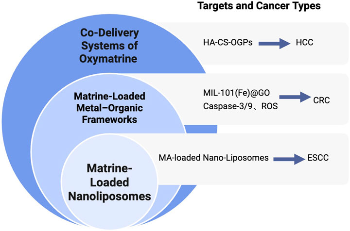 Malignant tumors currently pose a major global public health challenge, and the innovation of therapeutic strategies has long been a central focus of medical research. However, with the deepening understanding of major diseases such as cancer, inflammation, and neurodegenerative disorders, the limitations of conventional drug delivery methods—such as poor targeting, low bioavailability, and significant toxicity due to poor solubility—have become increasingly apparent (Amiryaghoubi et al., 2023; Qu et al., 2021). To address these issues, nano drug delivery systems (NDDS) have emerged and become a research hotspot in drug development and precision therapy in recent years. Compared with traditional drug delivery methods, targeted NDDS offer several advantages, including improved targeting, enhanced bioavailability, and reduced toxicity (Amiryaghoubi et al., 2023; Qiao et al., 2022; Luo Y. et al., 2023). The rise of NDDS has provided new strategies for the modernization and development of traditional Chinese medicine monomers such as matrine. By encapsulating matrine in liposomes, polymeric nanoparticles, solid lipid nanoparticles (SLNs), nanocrystals, nanogels, or stimulus-responsive nanoplatforms, its solubility and stability can be significantly improved, while enabling controlled release, tumor targeting, and microenvironmental responsiveness. Some studies have also explored the co-encapsulation of matrine with other anticancer drugs in multifunctional nanosystems to achieve combination therapy and synergistic antitumor effects. These approaches have shown considerable promise in overcoming drug resistance and reducing side effects. Therefore, matrine formulations developed using NDDS platforms represent a key strategy for promoting the translational development of this compound from basic research to clinical application.
