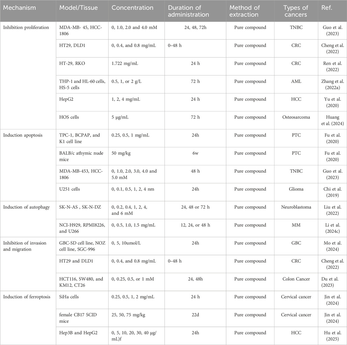 Malignant tumors are among the most serious diseases threatening human life and health, with incidence rates steadily rising each year, though their underlying mechanisms remain incompletely understood. According to GLOBOCAN data, by 2040, the global number of new cancer cases is projected to reach 28.4 million, posing a substantial threat to public health (Sung et al., 2021). At present, the main clinical treatment modalities include surgery, chemotherapy, radiotherapy, and molecular targeted therapy. However, their effectiveness is often limited by unsatisfactory therapeutic outcomes and severe adverse effects (Pei et al., 2022; Kessler et al., 2014). In the face of the global challenge of cancer prevention and control, the development of safe and effective antitumor agents has become a major focus for researchers worldwide. In recent years, natural products have demonstrated significant advantages in the comprehensive treatment of cancer, particularly in improving patients’ quality of life, prolonging survival, and reducing the toxic side effects associated with chemotherapy (Yu et al., 2024; Li H. et al., 2024; Lee et al., 2018). They have now emerged as an important strategy in the prevention and treatment of cancer.