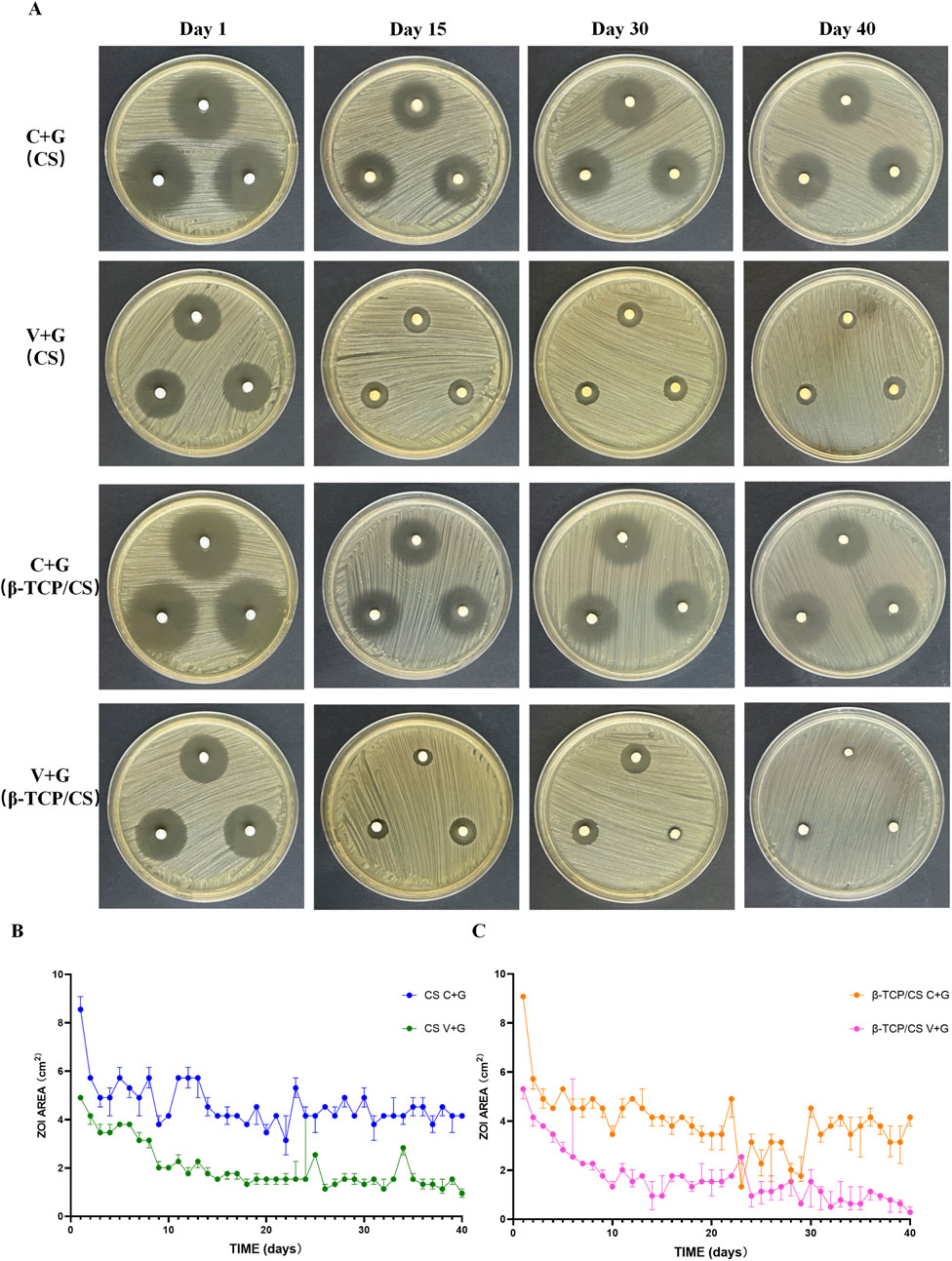 Plate culture images show bacterial growth inhibition zones under four treatment conditions (C+G, V+G, C+G in β-TCP/CS, and V+G in β-TCP/CS) across four time points (Day 1, 15, 30, 40). Graph B plots zone of inhibition (ZOI) areas for CS treatments over 40 days, with C+G and V+G showing varying effectiveness. Graph C compares β-TCP/CS treatments, illustrating a decrease in ZOI size over time for both conditions.