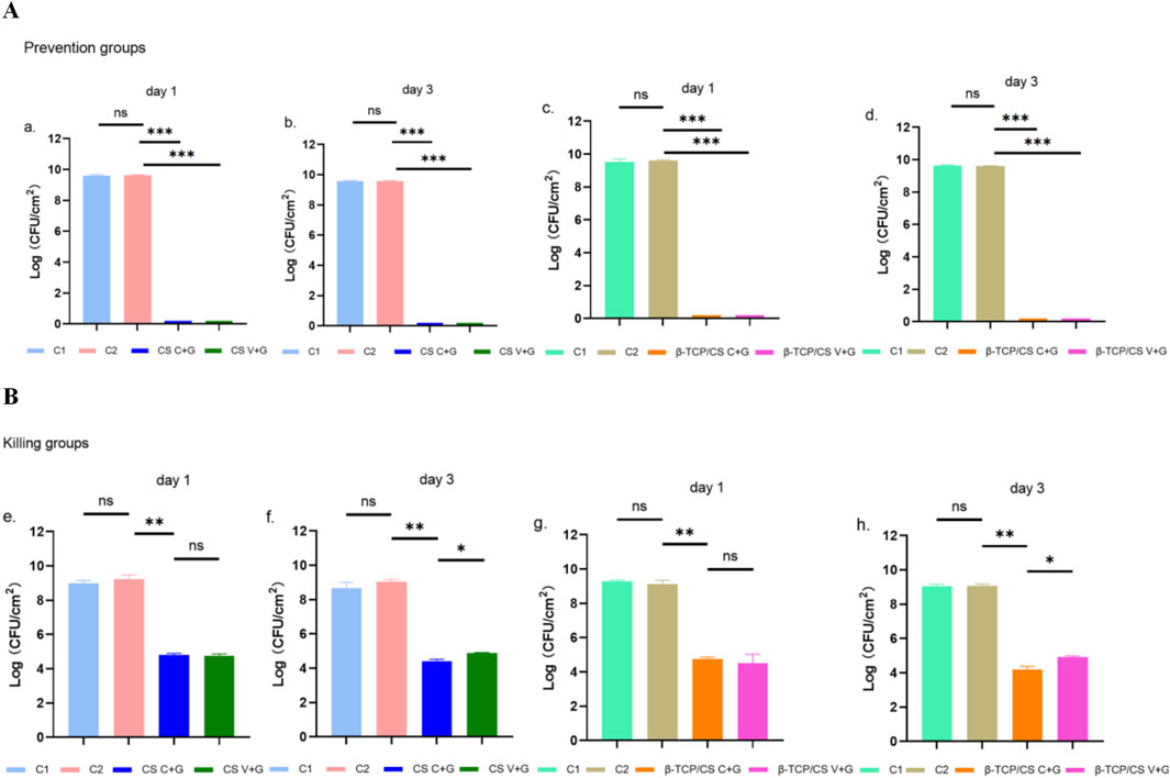 In the biofilm prevention assay, the control groups (without antibiotic beads, C1; unloaded beads, C2) exhibited high bacterial loads (108–109 CFU/mL). In contrast, the C + G and V + G treatment groups showed a significant reduction in biofilm bacteria by more than 8 log units on both day 1 and day 3 (P < 0.001). No statistically significant differences were observed between CS and β-TCP/CS beads, regardless of the antibiotic combination used, indicating that both carriers were equally effective in biofilm prevention (Figure 2A).