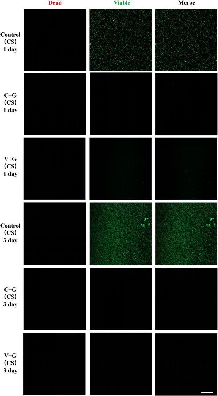 Fluorescence microscopy images showing dead and viable cells. Columns labeled as Dead (red), Viable (green), and Merge. Rows are labeled for Control (CS), C+G (CS), and V+G (CS) at one day and three days. The green fluorescence indicates viable cells, with more visible in control samples. Red is minimal, signifying few dead cells.