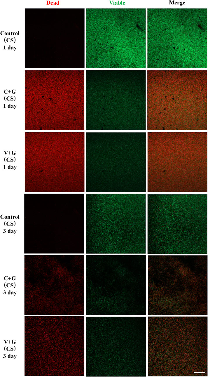 Fluorescent microscopy images show cell viability and death across different conditions. The rows represent different treatments: Control, C+G (CS), and V+G (CS) for one and three days. Columns show red for dead cells, green for viable cells, and their merged images. The intensity and distribution of colors vary, indicating changes in cell viability over time and differing conditions.