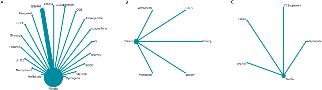 The network for psychological wellbeing (Figure 4C) was the most sparse, connecting five interventions. This network also followed a star-shaped pattern with placebo as the common comparator, indicating that all evidence was derived from placebo-controlled trials with no direct comparisons between the active interventions themselves for this outcome.