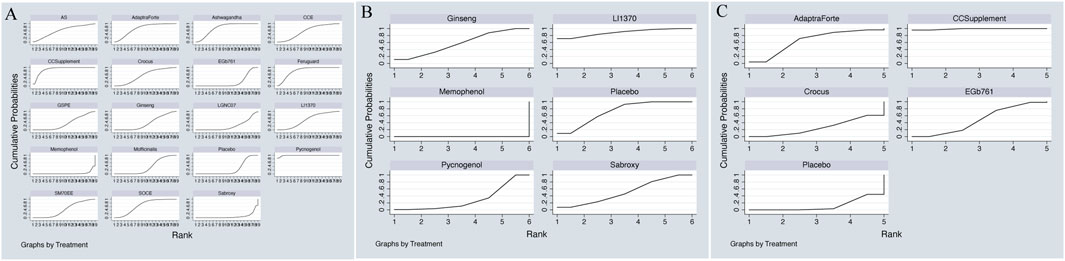 Figure 5. (A) SUCRA plot for cognitive function, (B) SUCRA plot for daily living, (C) SUCRA plot for psychological wellbeing.