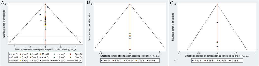 Separate funnel plots were constructed for all outcome indicators to test for potential publication bias. Visual inspection of the funnel plots did not suggest significant publication bias (Wallace et al., 2009). Details are shown in Figures 6A–C.