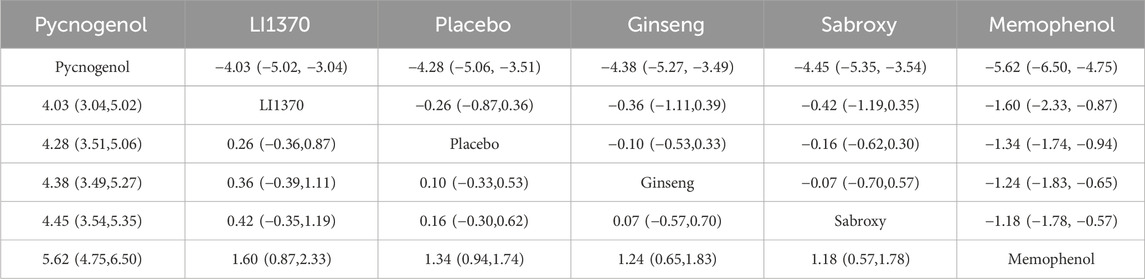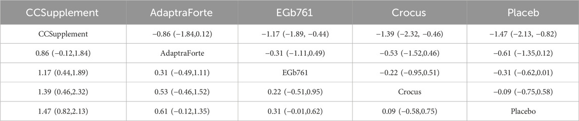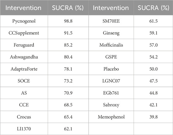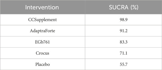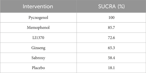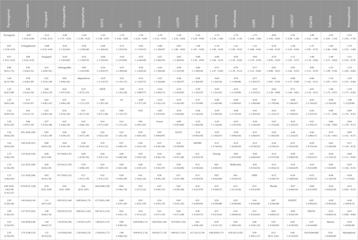 The results of the network meta-analysis indicated that CCSupplement [MD = 1.47, 95% CI = (0.82, 2.13)] was superior to the control group in improving mental and psychological scores relative to placebo. The probability ranking of plant extract interventions for improving mental and psychological scores showed CCSupplement ranked first in SUCRA (98.9%), as shown in Figure 5C. A comparison between the two interventions is presented in Table 6. The complete league table for psychological wellbeing is provided in Supplementary Table S6. To provide a more comprehensive overview of the ranking, the SUCRA values of all interventions for psychological wellbeing are presented in Table 7. The pairwise comparisons in Table 6, highlighting the findings for psychological wellbeing. The top-ranked CCSupplement showed a significant advantage over placebo (MD = −1.47, 95% CI = [-1.93, −1.02]). The direct comparison between CCSupplement and the second-ranked Adaptraforte indicated a non-statistically significant trend in favor of CCSupplement (MD = −0.26, 95% CI = [-1.14, 0.61]).