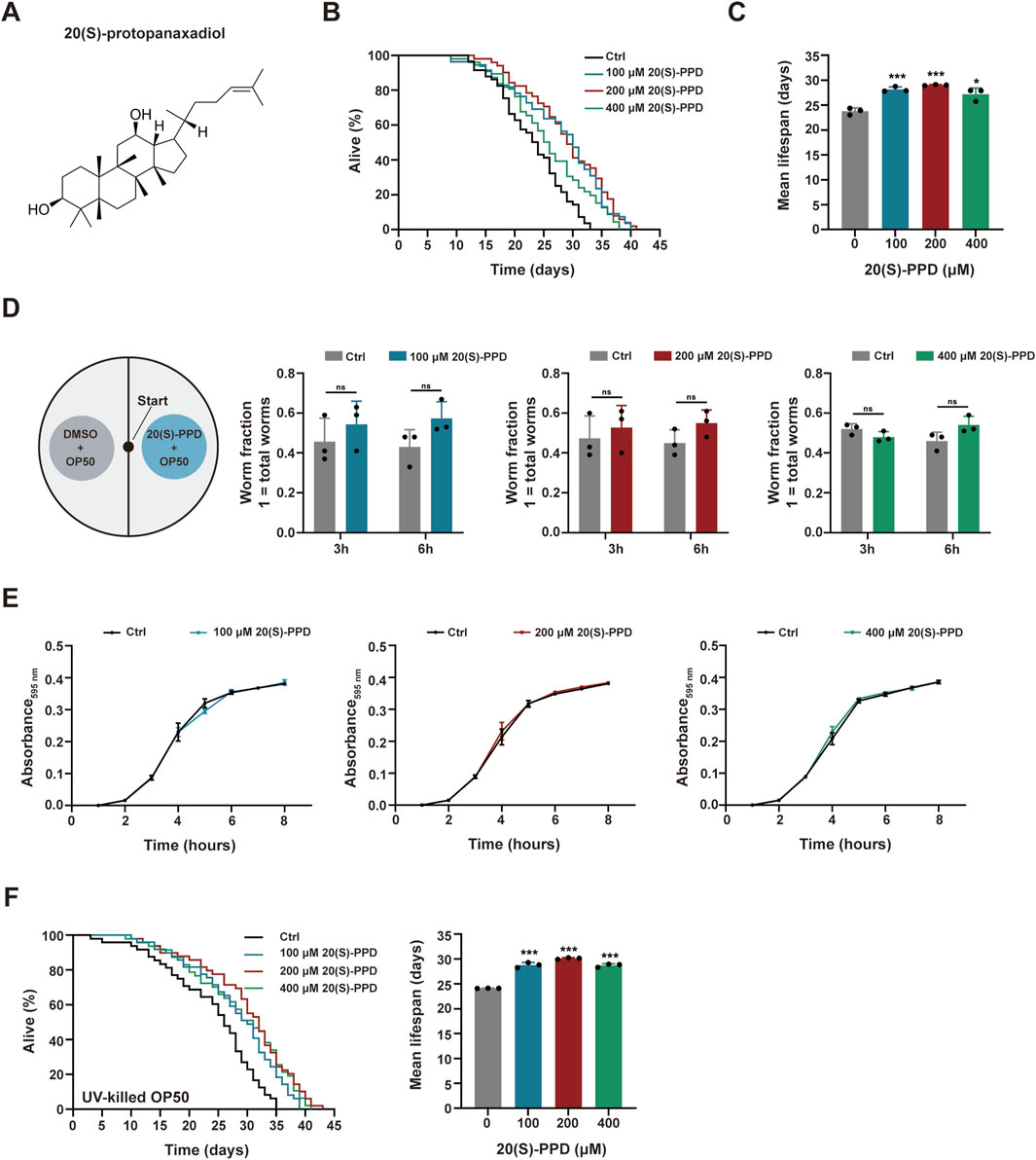 Figure 1. 20(S)-PPD extends lifespan of (C) elegans. The strains used were: N2, wild type. Ctrl, treated with DMSO. 20(S)-PPD, treated at concentrations of 100, 200, and 400 μM 20(S)-PPD, separately. (A) The chemical structure of 20(S)-PPD. (B,C) Lifespan assays for N2 treated with concentrations of 100, 200, and 400 μM 20(S)-PPD, separately. For each group, worms were counted as detailed in the methods (n > 30). Survival plot (B) and average lifespan (C) of each group (n = 3). (D) A bacterial avoidance assay was performed using 20(S)-PPD treated-Escherichia coli OP50 bacteria. The N2 worms (L4 larvae n = 50) were transferred to the NGM plate’s center, where the left side bacteria contained 100, 200, and 400 μM 20(S)-PPD dissolved in Escherichia coli OP50 bacteria, whereas those on the right side did not (Ctrl). The number of worms on each side of the agar plate was evaluated by picking and counting them after 3 and 6 h. The ratio of the number of worms crawling on each side of the plate indicated the worm fraction (n = 3). (E) Treatment with 20(S)-PPD at 100, 200, and 400 μM for 8 h made no difference on the growth of OP50 bacteria compared to the Ctrl group. (F) Lifespan assays for N2 treated with concentrations of 100, 200, and 400 μM 20(S)-PPD feeding with UV-killed Escherichia coli OP50 bacteria, separately. For each group, worms were counted as detailed in the methods (n > 30). Survival plot (left) and average lifespan (right) of each group (n = 3). Statistical analysis of the lifespan was performed using GraphPad 9 and p values were calculated by the log-rank test. Numerical data were analyzed by Student’s t-test and values were presented as mean ± SD. ns, no significance; statistical significance is indicated as *p < 0.05, **p < 0.01, and ***p < 0.001 compared to the Ctrl group.
