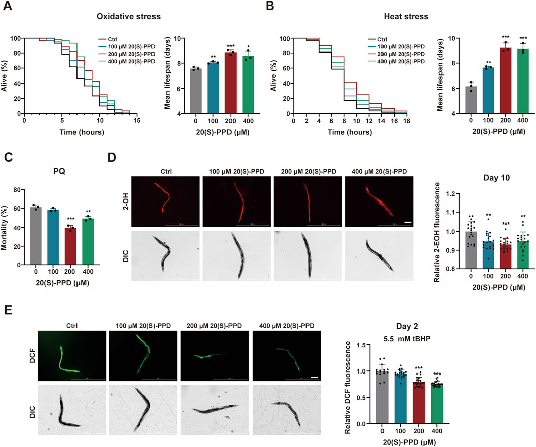 For oxidative stress resistance, worms were treated with 100, 200, or 400 μM 20(S)-PPD from egg stage to day 1, while control cohorts received 0.1% DMSO. Day 1 worms were transferred to NGM plates containing 9.125 mM tBHP to induce ROS accumulation (Li et al., 2019). Approximately 45 worms per group were incubated at 20 °C, and mortality was recorded hourly until all worms had died. Worms that did not respond to prodding with a platinum wire probe were considered dead. Survival curves were generated, and assays were repeated three times independently. Furthermore, 1-day-old worms were exposed to 200 mM paraquat (PQ) for 4 h, and mortality was quantified as described previously (approximately 100 worms per group, three independent replicates) (Huang et al., 2025).