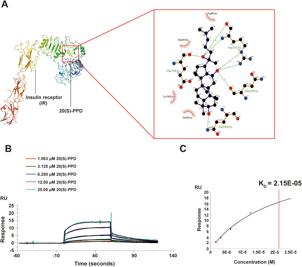 Figure 4. 20(S)-PPD bounds to IR in vitro. (A) 3D diagrams (left) and 2D (right) diagrams of the docked structure of 20(S)-PPD in the active domain of the IR. (B,C) SPR analysis of 20(S)-PPD binding to IR protein (B) and KD value was calculated (C).