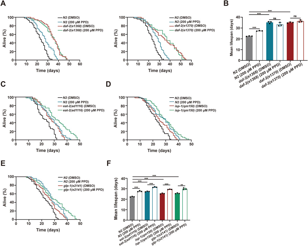 Figure 5. 20(S)-PPD increases (C) elegans lifespan via IR/DAF-2 signaling pathway. The strains utilized included N2, wild type; CB1370, daf-2(e1370); CB1368, daf-2(e1368); MQ887, isp-1(qm150); DA1116, eat-2(ad1116); CB4037, glp-1(e2141). Ctrl, treated with DMSO. PPD, treated with 200 μM 20(S)-PPD. (A,B) Lifespan experiments were performed on daf-2 gene mutants, including daf-2(e1368) and daf-2(e1370), exposed to 200 μM 20(S)-PPD. (A) The survival curve and (B) the average lifespan of each group (n = 3). For each group, >30 worms were counted as detailed in the methods. (C–F) Lifespan assays for mutants of longevity-related pathway genes after 200 μM 20(S)-PPD treatment. (C–E) The survival curve of mutants of longevity-related pathway genes including eat-2(ad1116) (C), isp-1(qm150) (D), and glp-1(e2141) (E) exposed to 200 μM 20(S)-PPD. (F) The average lifespan of each group (n = 3). For each group, >30 worms were counted as detailed in the methods. Statistical analysis of the lifespan was performed using GraphPad 9 and p values were calculated by the log-rank test. Numerical data were analyzed by Student’s t-test and values were presented as mean ± SD. ns, no significance; statistical significance is indicated as **p < 0.01 and ***p < 0.001.