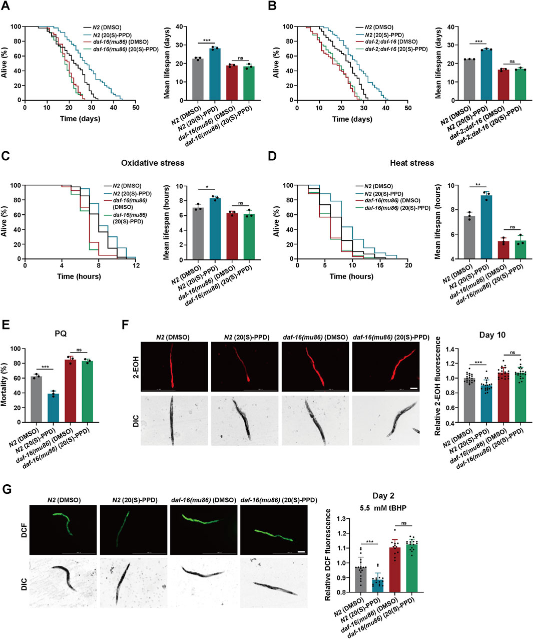 Figure 6. 20(S)-PPD increases (C) elegans lifespan and stress tolerance via FOXO/DAF-16. The strains utilized included N2, wild type; CF1308, daf-16(mu86); daf-2;daf-16, daf-2(e1370);daf-16(mu86). DMSO, treated with DMSO. 20(S)-PPD, treated with 200 μM 20(S)-PPD. (A,B) Survival plot and average lifespan for daf-16 gene mutants (A) and daf-2;daf-16 double mutants (B) exposed to 200 μM 20(S)-PPD. For each group, more than 30 worms were counted as detailed in the methods (n = 3). (C,D) Survival plot and average lifespan for daf-16 gene mutants exposed to 200 μM 20(S)-PPD. (C) Oxidative stress. (D) Heat stress. For each group, more than 30 worms were counted as detailed in the methods (n = 3). (E) The resistance to oxidative stress of daf-16 gene mutants to 200 mM PQ (n = 50 worms for each group each time, experiment repeated 3 times). (F) ROS levels of 20 adult daf-16 gene mutants exposed to 200 μM 20(S)-PPD at day 10 using DHE staining. The scale bar indicates 0.2 mm. (G) ROS levels of tBHP-treated 20 adult daf-16 gene mutants exposed to 200 μM 20(S)-PPD at day 2 using CM-H2DCFDA staining. The scale bar indicates 0.2 mm. The fluorescence intensity was analyzed with ImageJ. Statistical analysis of the lifespan was performed using GraphPad 9 and p values were calculated by the log-rank test. Numerical data were analyzed by Student’s t-test and values were presented as mean ± SD. ns, no significance; statistical significance is indicated as *p < 0.05, **p < 0.01, and ***p < 0.001.