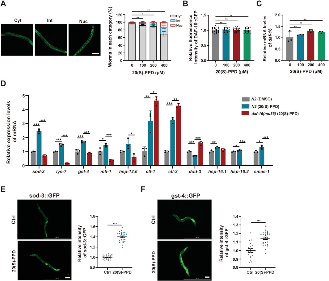 Figure 7. The nuclear localization of FOXO/DAF-16 mediated by 20(S)-PPD to modulate its target genes expression. The strains utilized included N2, wild type; TJ356, zIs356[daf-16::gfp]; CF1553, muIs84 [(pAD76) sod-3p::GFP + rol-6(su1006)]; CL2166, dvIs19[(pAF15) gst-4p::GFP::NLS]; CF1308, daf-16(mu86). Ctrl, treated with DMSO. 20(S)-PPD, treated with 100, 200, or 400 μM 20(S)-PPD. (A) Representative images of specific cellular localization patterns of DAF-16:GFP in the intermediate, cytoplasmic, and nuclear compartments (left), and the statistical data of DAF-16:GFP cellular localization patterns after 20(S)-PPD treatment (right). (B) Corresponding quantification of fluorescence intensity values of DAF-16:GFP. (C) RT-qPCR was employed to measure the mRNA levels of daf-16 genes after 20(S)-PPD treatment. (D) RT-qPCR was carried out to assess the mRNA levels of 11 daf-16 target genes in both N2 and daf-16 mutant strains after 20(S)-PPD treatment. (E,F) The post-20(S)-PPD treatment green fluorescence of CF1553 worms with a SOD-3:GFP fusion gene (E) and CL2166 worms with a GST-4:GFP fusion gene (F) were detected by fluorescence microscopy. Representative images are shown on the left, and ImageJ was employed to assess the relative fluorescence intensity (right). Scale bars: 200 µm. Statistical analysis were analyzed by Student’s t-test and values were presented as mean ± SD. Statistical significance is indicated as *p < 0.05, **p < 0.01, and ***p < 0.001.