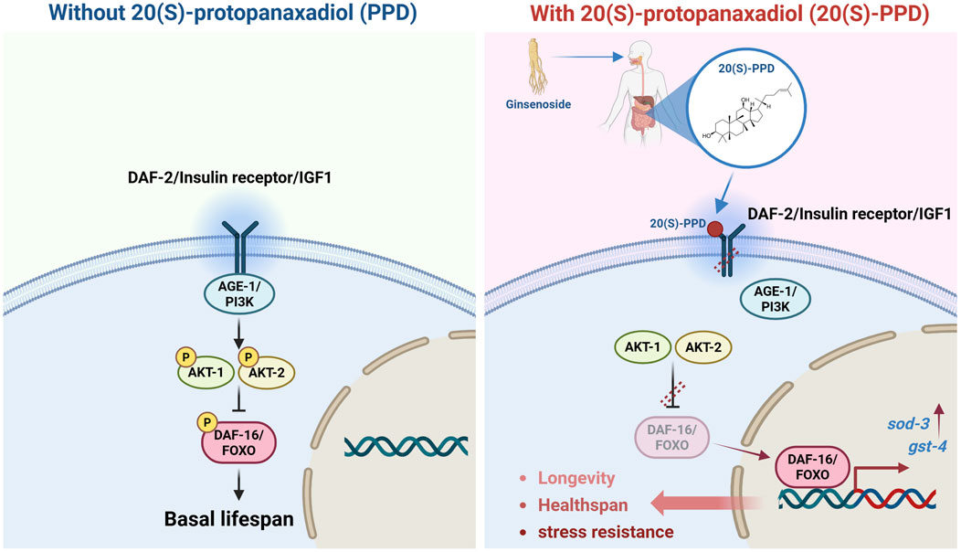 Here, the effects of 20(S)-PPD in the modulation of aging were investigated in C. elegans. The results suggested that 20(S)-PPD not only prolonged lifespan and healthspan but also enhanced tolerance to multiple stressors and reduced ROS levels. 20(S)-PPD was found to bind to IR in vitro. Moreover, 20(S)-PPD-mediated longevity extension was dependent on the IIS pathway, thereby inducing the nuclear translocation of DAF-16/FOXO to enhance transcription of target genes. These results demonstrate that IR is a previously unrecognized target of 20(S)-PPD and show the effectiveness of 20(S)-PPD in alleviating the effects of aging, suggesting its potential in preventing and treating aging and age-related conditions.