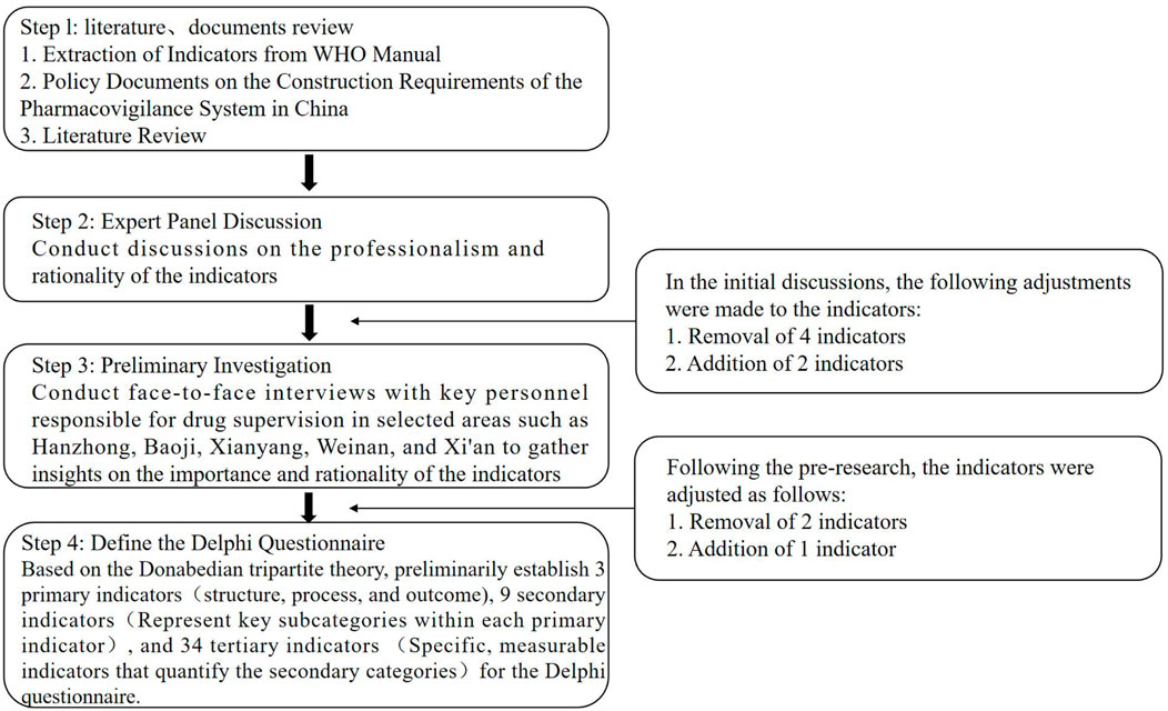 The development process of the main Delphi questionnaire is illustrated in Figure 1. First, we summarized the framework and basic indicator requirements for pharmacovigilance system construction based on the WHO manual and combined this with a detailed framework formulated through a review of China’s historical policies on adverse drug reaction regulation and literature research. Second, we conducted interviews with four experts from provincial drug regulatory authorities based on the preliminary indicators, making initial modifications that focused on the indicators’ professional relevance, reasonability, and scope. Third, we conducted pre-tests and interviews with key personnel from drug regulatory agencies in Hanzhong, Baoji, Xianyang, Weinan, and Xi’an, that focused on the importance and reasonability of the indicators and made further modifications to them based on these interview results. Finally, the Delphi questionnaire, was revised for appropriate wording and was then used as the survey tool to obtain expert responses.