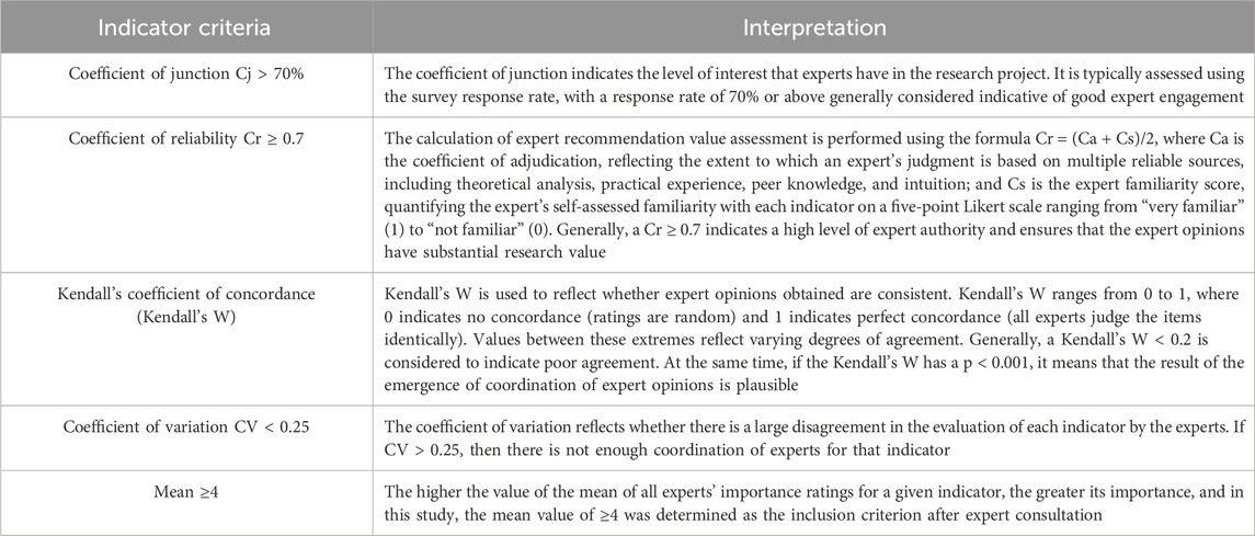Indicators were retained based on specific criteria. That is, the Delphi indicators were included only if they simultaneously met the conditions in Table 1.