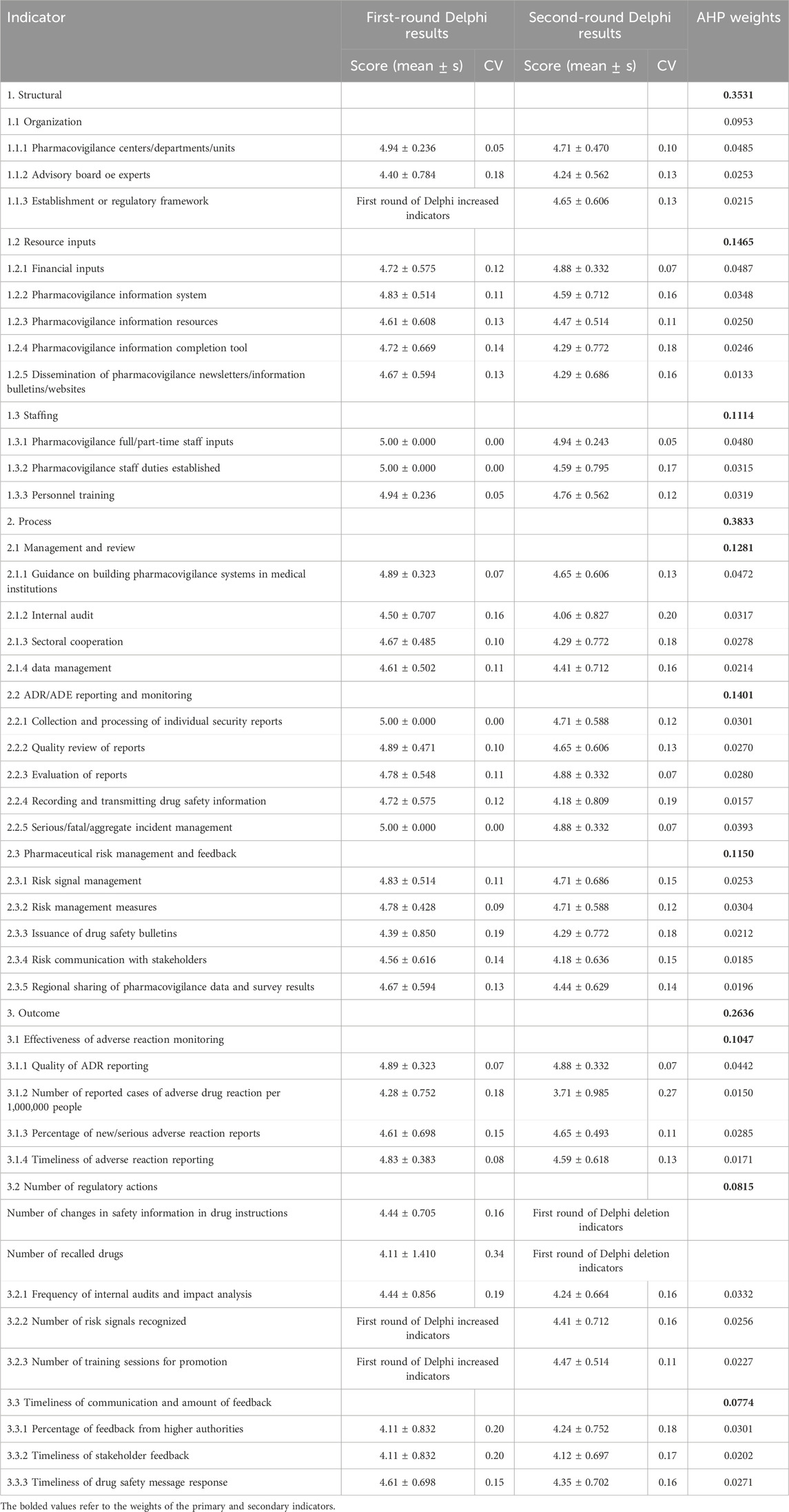 The established preliminary indicator framework with primary indicators encompassed three dimensions: structure, process, and outcomes. Within the structure indicators, there were three secondary indicators: organizational structure, resource inputs, and staffing. The process indicators’ secondary indicators revolved around the specific content and support of pharmacovigilance, including management and review, ADR/ADE reporting and monitoring, and pharmaceutical risk management and feedback, and the outcome indicators demonstrate certain performance aspects related to pharmacovigilance activities, including the effectiveness of adverse reaction monitoring, the number of regulatory actions, and the timeliness of communication and amount of feedback. Finally, each secondary indicator had corresponding tertiary indicators.