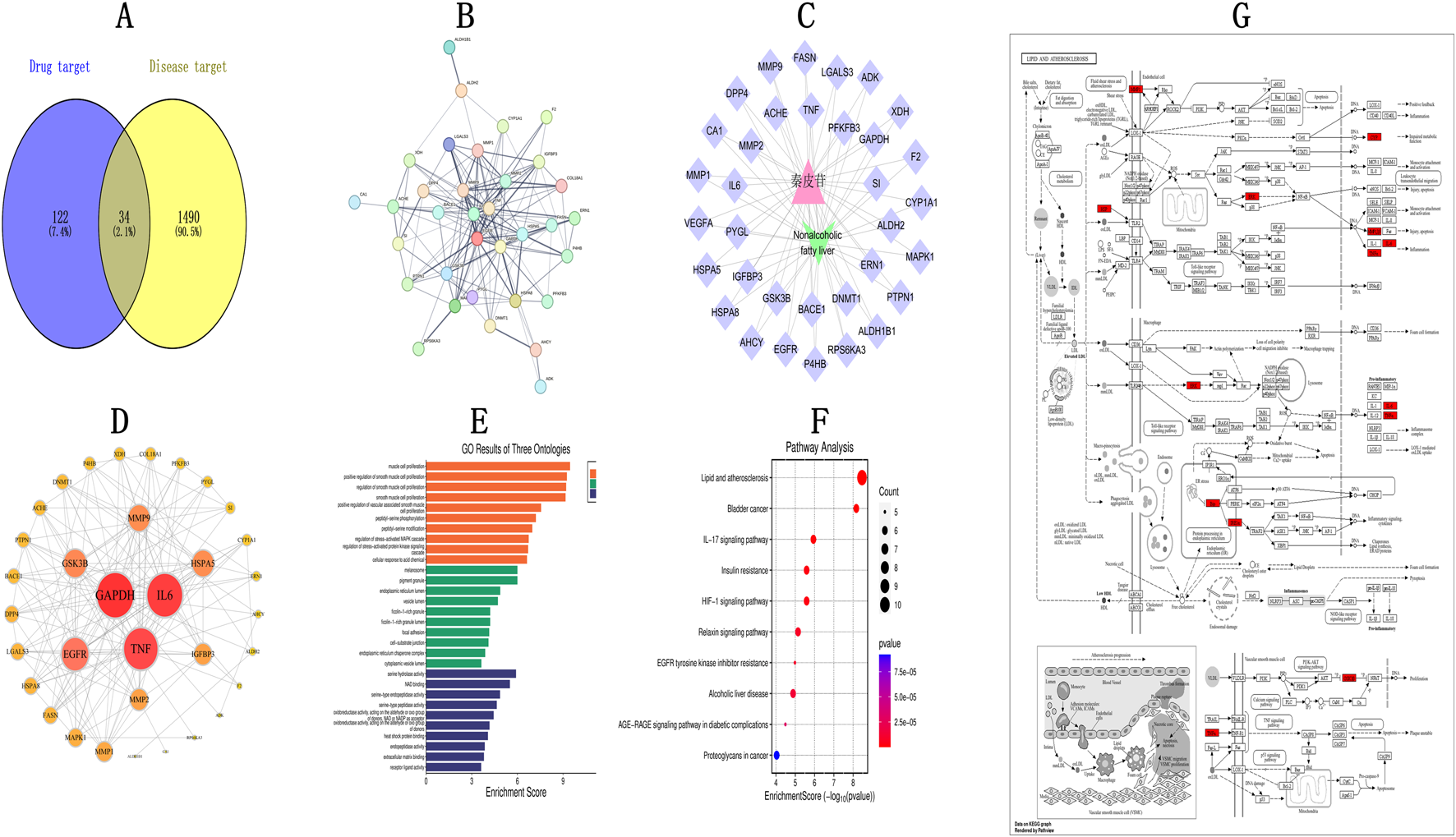 Network Pharmacology Analysis of Fraxin in NAFLD Management (A) Overlap between compound targets and NAFLD-linked targets. (B) PPI interaction network. (C) TCM-Target-Disease network diagram. (D) Protein-protein interactions. (E) GO analysis. (F) KEGG analysis (Y-axis: pathway names, X-axis: enrichment levels). (G) Lipid and atherosclerosis pathway. NAFLD, non-alcoholic fatty liver disease; TCM, Traditional Chinese Medicine; GO, Gene Ontology; PPI, protein-protein interaction; and KEGG, Kyoto Encyclopedia of Genes and Genomes.