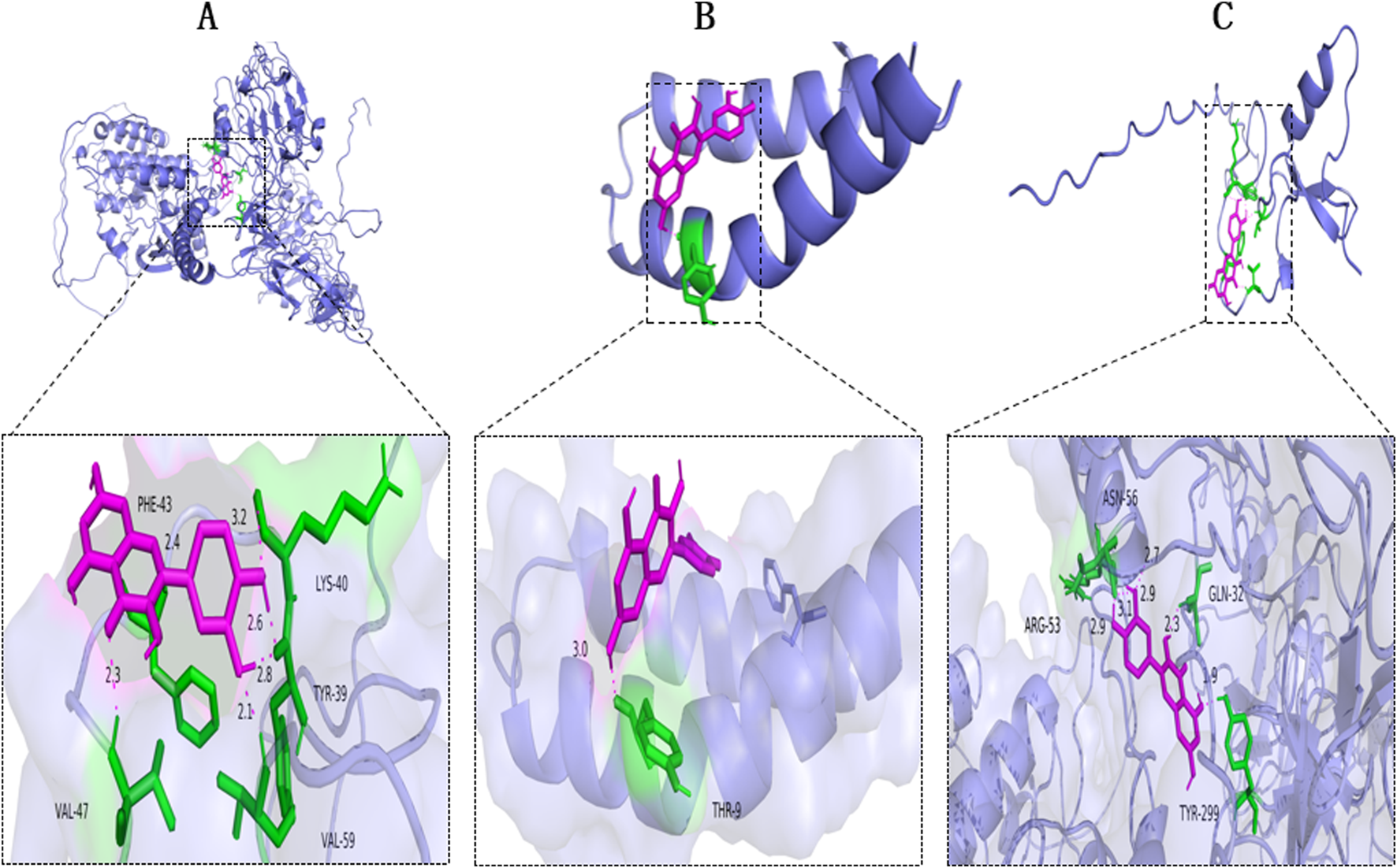 Molecular Docking of Fraxin with NAFLD-related Core Targets. Docking diagrams with (A) GAPDH, (B) IL-6, and (C) TNF-α. AFLD, non-alcoholic fatty liver disease; GAPDH, glyceraldehyde-3-phosphate dehydrogenase; IL-6, interleukin 6; and TNF-α, tumor necrosis factor-alpha.
