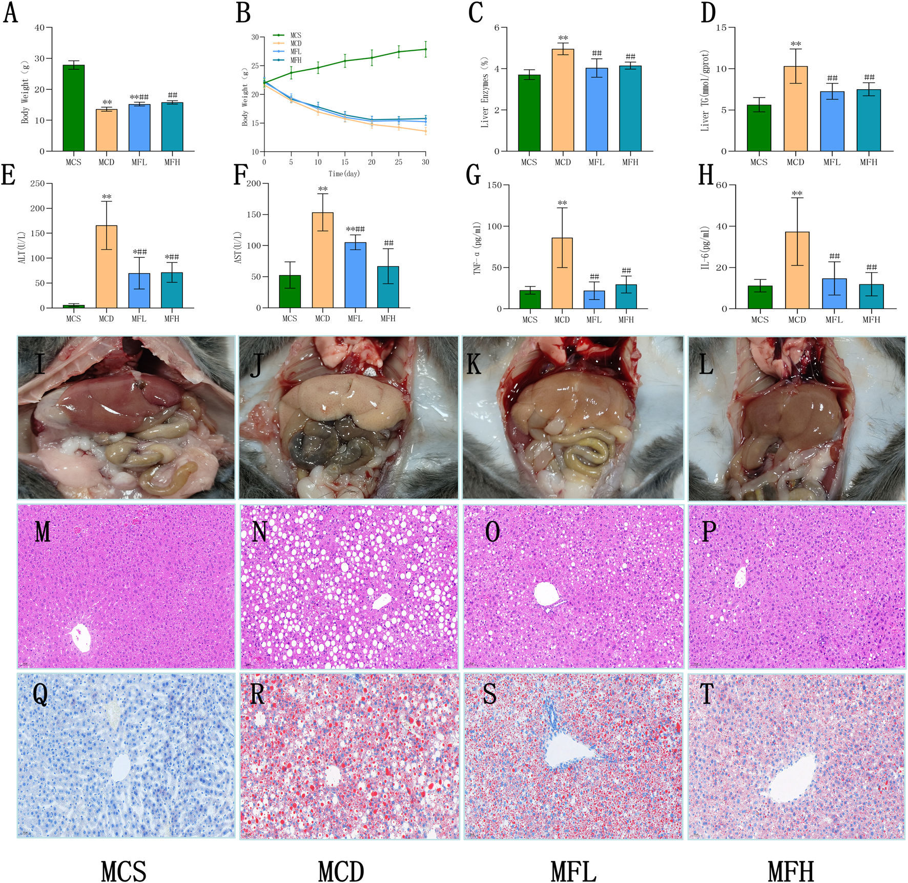 Fraxin improves biochemical indicators and histopathology in MCD diet-induced NAFLD mice (A) Body weight after 30 days. (B) Changes in body weight over 30 days. (C) Liver index after 30 days. (D) Liver TG content. (E) ALT. (F) AST. (G) TNF-α. (H) IL-6. (I–L) Gross appearance of mouse livers. (M–P) H&E staining at ×200 magnification. (Q–T) Oil Red O staining at ×200 magnification. **p < 0.01, *p < 0.05, compared with the MCS group; ##p < 0.01, #p < 0.05, compared with the MCD group. NAFLD, non-alcoholic fatty liver disease; IL-6, interleukin 6; TNF-α, tumor necrosis factor-alpha; H&E, hematoxylin and eosin stain; TG, triglyceride; MCD, methionine-choline-deficient; ALT, aspartate alanine aminotransferase; MCS, methionine-choline sufficient; and AST, aminotransferase.
