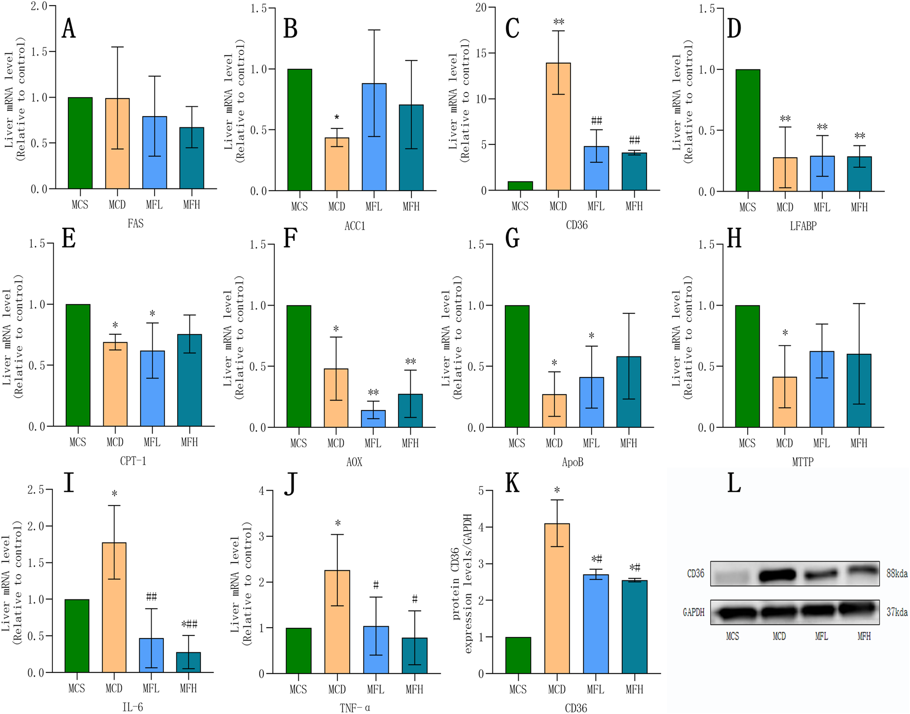 Impact of Fraxin on Gene and Protein Expression (A–J) mRNA expression of FAS, ACC1, FAT/CD36, IL-6, LFABP, CPT-1, AOX, ApoB, TNF-α, and MTTP across four groups. (K,L) Protein expression of FAT/CD36. **p < 0.01, *p < 0.05, compared with the MCS group; ##p < 0.01, #p < 0.05, compared with the MCD group. MCD, methionine-choline-deficient; MCS, methionine-choline sufficient; FAS, fatty acid synthase; ACC1, acetyl-CoA carboxylase 1; FAT/CD36, fatty acid translocase/cluster of differentiation 36; IL-6, interleukin 6; LFABP, liver-type fatty acid binding protein; CPT-1, carnitine palmitoyltransferase 1α; AOX, acyl-CoA oxidase; ApoB, apolipoprotein B; TNF-α, tumor necrosis factor-alpha; and MTTP, microsomal triglyceride transporter.