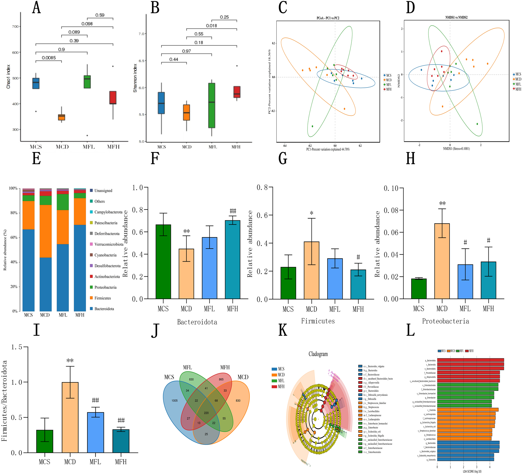 Fraxin’s effect on the Gut Flora (A) Alpha diversity analysis: Chao1 index before and after fraxin intervention in the MCD group. (B) Alpha diversity analysis: Shannon index. (C) PCA of gut flora. (D) NMDS of gut flora. (E) Relative abundance of gut flora at the phylum level. (F–H) Changes in the Bacteroidota, Firmicutes, and Proteobacteria abundance. (I) F/B ratio. (J) Distribution of gut flora. (K,L) Taxonomic cladograms and LDA score distribution histograms generated by the LDA effect size. **p < 0.01, *p < 0.05, compared with the MCS group; ##p < 0.01, #p < 0.05, compared with the MCD group. MCD, methionine-choline-deficient; MCS, methionine-choline sufficient; PCA, Principal Component Analysis; NMDA, N-methyl-D-aspartate; and LDA, Linear Discriminant Analysis.