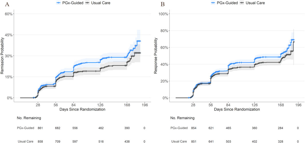 Figure 1. Cumulative Incidence of Remission and Response by Study Arm. Kaplan-Meier curves showing cumulative incidence of remission (A) and response (B) over time for patients receiving PGx-guided treatment or usual care using reported visit date (days since randomization) as the timescale for clarity. Shaded areas indicate 95% confidence intervals. The number of individuals remaining event-free per treatment group are shown below the x-axis. Censoring is indicated by cross tick marks on each curve. Note that the primary analysis used study week as the timescale and group differences were not evaluated using reported visit date.