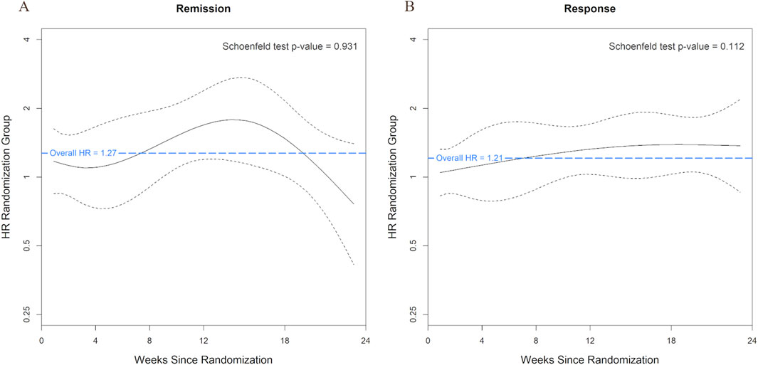 Figure 2. Time-Varying Effects of Study Arm on Remission and Response on the Log Hazard Ratio Scale. Smoothed trend lines of scaled Schoenfeld residuals for the effect of study arm on remission (A) and response (B) using study week as the timescale. A blue horizontal dashed line indicates the overall hazard ratio estimated from the Cox model. Black dashed lines represent the 95% confidence band around the smoothed effect estimate over time. Systematic deviation from the confidence band may indicate violation of the proportional hazards assumption.