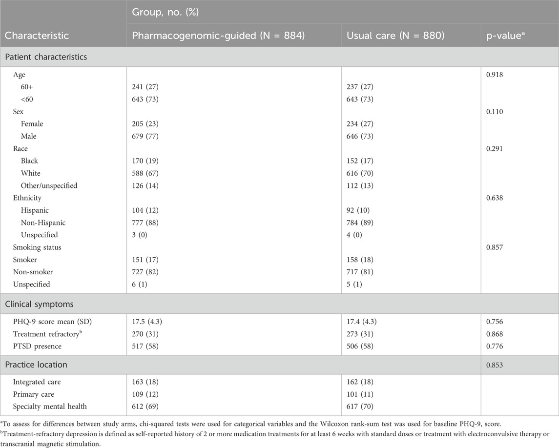 Out of the 1,944 patients in the PRIME Care study, 180 (9.3%) were excluded due to having only baseline data remaining after right censoring, leaving 1,764 patients available for analysis (90.7%; n = 884 in the PGx-guided arm and n = 880 in the usual care arm), with the majority being under 60 years of age (73% in the PGx-guided arm, 73% in the usual care arm) and male (77% in the PGx-guided arm, 73% in the usual care arm) (Table 1; Supplementary Figure S1). This cohort was also mostly White (67% in the PGx-guided arm, 70% in the usual care arm), non-Hispanic (88% in the PGx-guided arm, 89% in the usual care arm), and non-smoking (82% in the PGx-guided arm, 81% in the usual care arm). Both arms had equal proportions of individuals with moderately severe depression (mean PHQ-9 values of 17.5 and 17.4, respectively), treatment refractory depression (31%), and comorbid PTSD (58%).