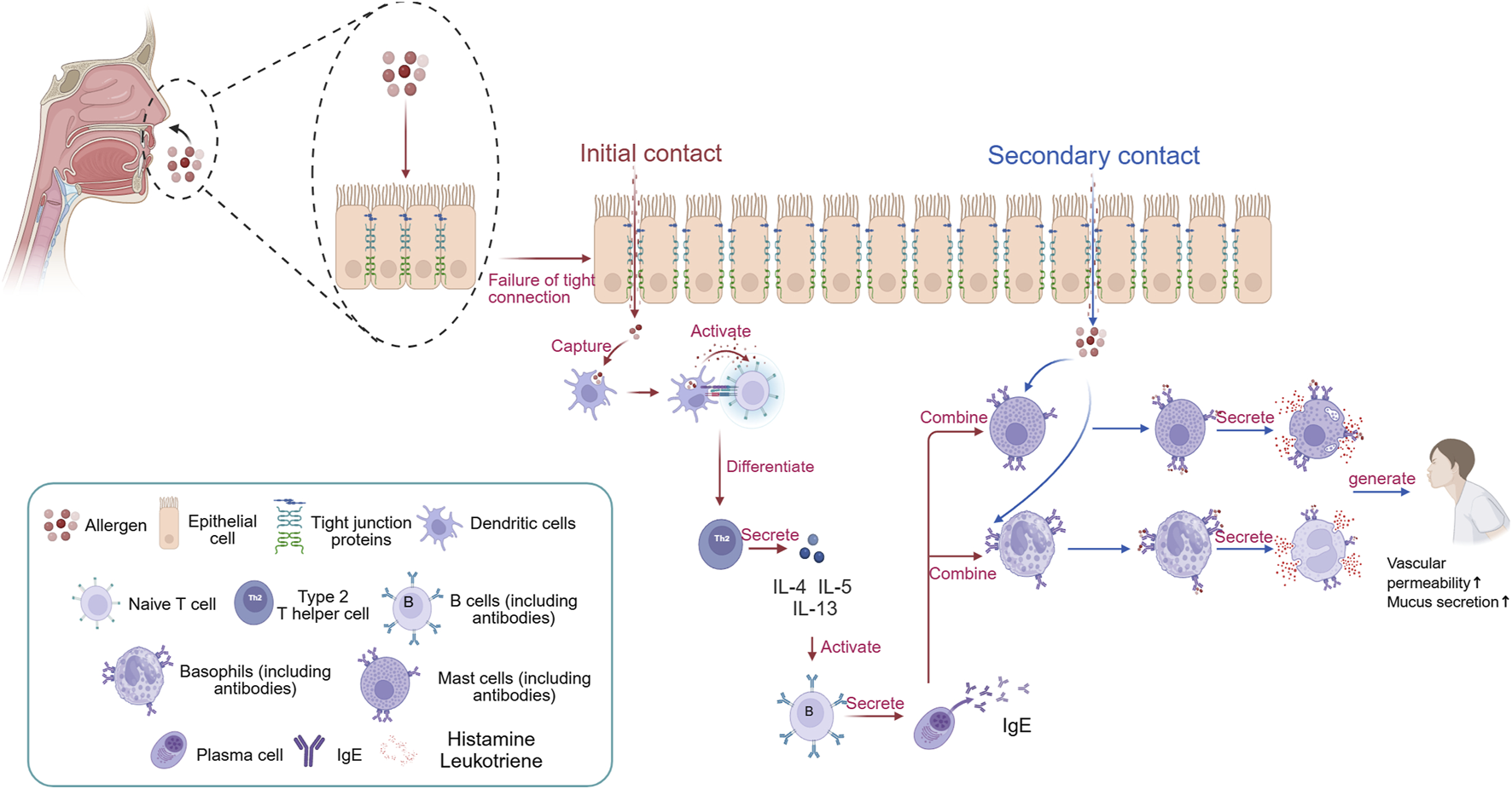 The traditional pathogenesis of AR. When the body first encounters allergens, they disrupt the tight junction proteins of epithelial cells, allowing them to enter the body. At this point, dendritic cells engulf the allergen and degrade it into peptide fragments. Subsequently, dendritic cells transmit signals to naive T cells, causing them to differentiate into Th2 cells. The cytokines produced by Th2 cells (IL-4, IL-5, and IL-13) stimulate B cells to differentiate into plasma cells, which then secrete IgE antibodies. The constant region of IgE antibodies in the body targets mast cells and eosinophils, where they reside in a latent state. When the body is re-exposed to the same allergen, the allergen can specifically bind to the variable region of IgE antibodies on the surface of mast cells and eosinophils. Stimulated mast cells and eosinophils then degranulate, releasing inflammatory mediators such as histamine and leukotrienes, leading to the occurrence of AR. Created in BioRender. xi, l. (2025) https://BioRender.com/pch6h63.