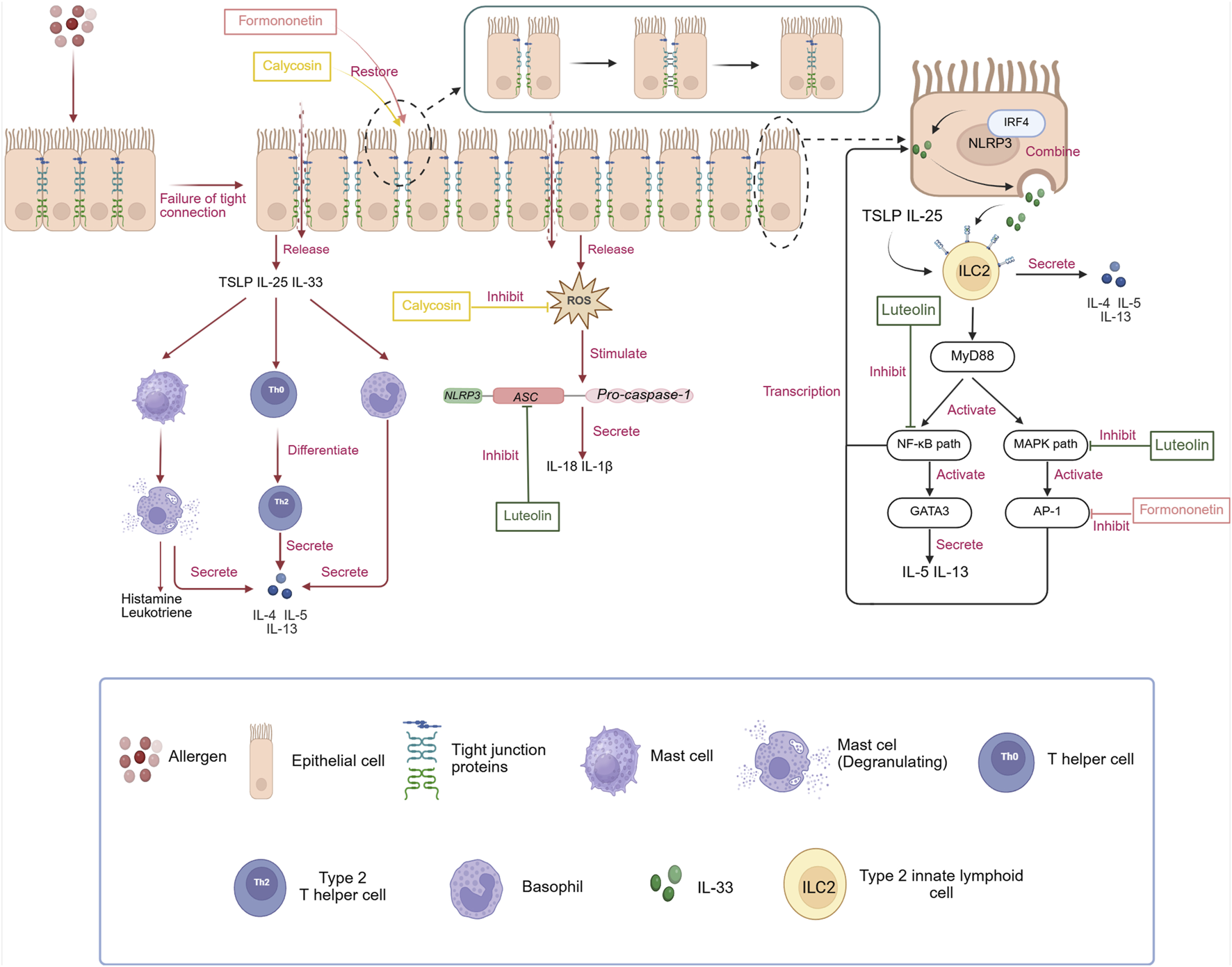 The pathogenesis of AR independent of IgE and the regulatory effects of three monomeric compounds (luteolin, calycosin, and formononetin)on the NLRP3/IL-33/ILC2s pathway in treating AR. i: Unlike the traditional pathogenesis of AR, allergens, after disrupting the tight junction proteins of epithelial cells, cause the release of alarmins, such as TSLP, IL-25, and IL-33, as well as inflammatory substances like ROS. These alarmins directly stimulate the differentiation of Th0 cells into Th2 cells and also directly trigger the secretion of Th2-type cytokines from mast cells and basophils, creating an inflammatory environment. ROS, in turn, directly promote the assembly of downstream NLRP3 inflammasomes, leading to the release of IL-18 and IL-1β, which exacerbate the symptoms of AR. In addition, NLRP3 exists independently of the inflammasome in the nucleus of epithelial cells, interacts with IRF4, binds directly to the IL-33-specific promoter, and activates the transcription of IL-33, increasing its expression. IL-33 released from epithelial cells can also synergistically promote the activation of ILC2 cells with alarmins such as IL-25 and TSLP, leading to a series of subsequent inflammatory reactions. ii: Luteolin can inhibit the activation of the NLRP3 inflammasome by preventing ASC oligomerization, thereby reducing the expression of IL-18 and IL-1β. Furthermore, it can block the MAPK and NF-κB pathways to decrease the transcription of IL-33, thereby regulating the NLRP3/IL-33/ILC2s pathway to treat AR. Calycosin can directly inhibit the generation of ROS, interrupting the signaling for the assembly of the NLRP3 inflammasome. Formononetin can downregulate the expression of the IL-33 transcription factor AP-1 to treat AR. It is worth noting that both calycosin and formononetin can promote the repair of the epithelial cell barrier, fundamentally reducing the stimulation of allergens on epithelial cells and the release of inflammatory factors. Created in BioRender. xi, l. (2025) https://BioRender.com/yxemxgb.