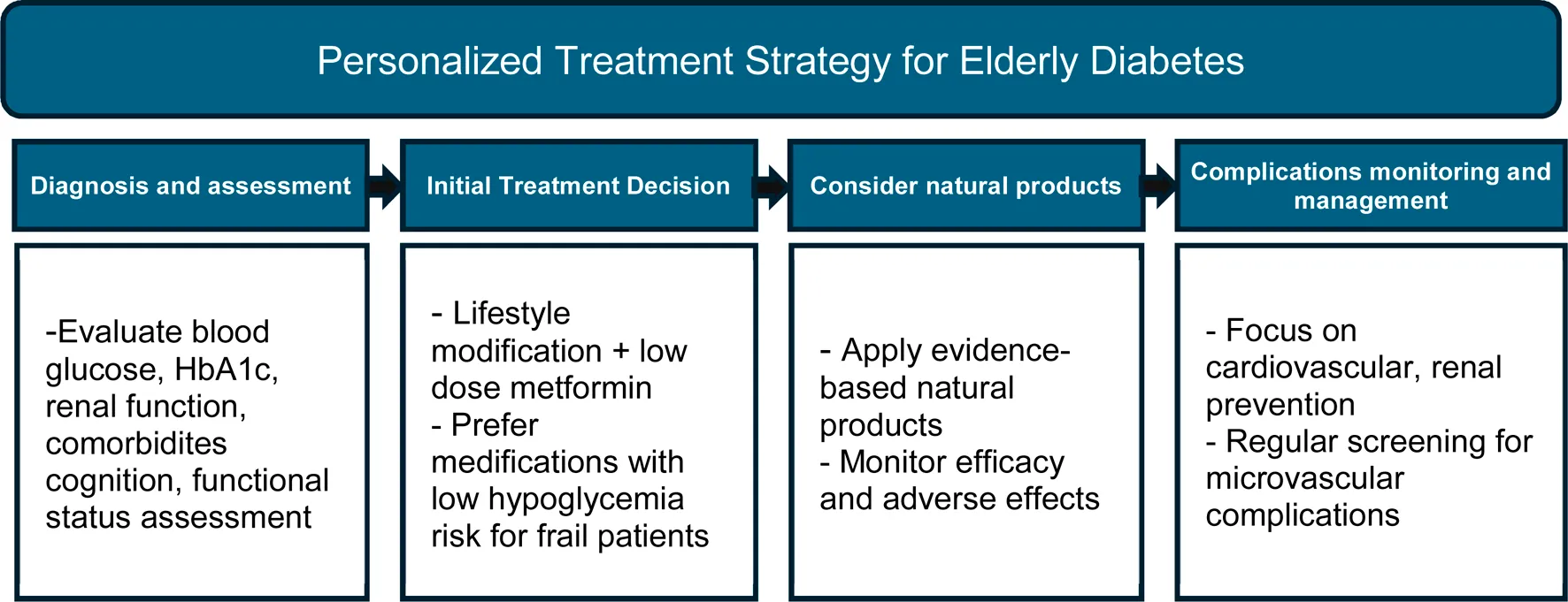 In this review, we aimed to provide a comprehensive and accessible synthesis on elderly-onset diabetes and natural product-based interventions. Given the limited availability of integrative reviews on this topic, we incorporated evidence from clinical, animal, and cellular studies to emphasize their potential applications in practice. For this, we summarize the characteristics of age-related diabetes and explores the potential of natural bioactive compounds for its prevention and treatment. We focus on the mechanisms of action and therapeutic effects of Enteromorpha prolifera oligosaccharides, Ficus species, genipin, gingerol, myricitrin, mulberry, quercetin, resveratrol, and saffron in age-related diabetes and its complications (Table 3; Figure 2).