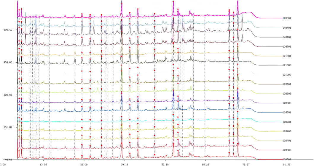 Analysis: An Agilent LC-1260 high-performance liquid chromatograph (HPLC) was utilized for analysis and the establishment of the fingerprint spectrum. The chromatographic conditions were as follows: Column: Cosmosil column (5 μm, 4.6 × 250 mm); Wavelength: 208 nm; Flow rate: 0.8 mL/min; Column temperature: Ambient; Mobile phase: Gradient elution comprising acetonitrile and 0.1% phosphoric acid water (0–40 min, 6%–16% acetonitrile; 40–75 min, 16%–30% acetonitrile; 75–77 min, 30%–6% acetonitrile; 77–90 min, 6% acetonitrile). The reference solution and the sample solution were injected under these chromatographic conditions, and the chromatograms were recorded. Utilizing the Fingerprint Similarity Evaluation System 2004A (National Pharmacopoeia Commission), the peaks indicated on the reference chromatogram were matched, multi-point correction was performed, and the similarity was calculated.