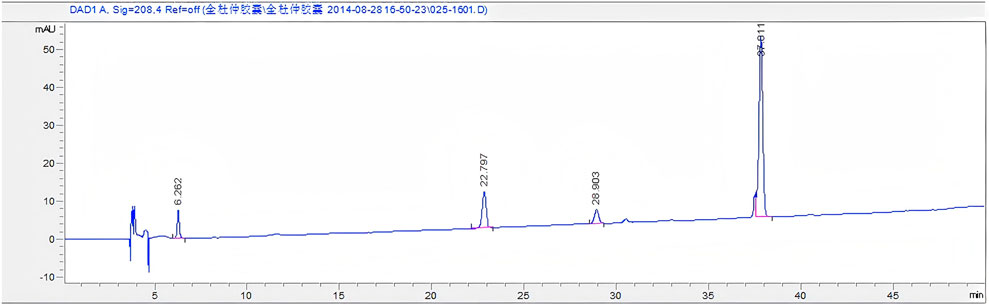 Quanduzhong capsules contain E. ulmoides extract and are approved by China’s Food and Drug Administration. Each 0.48 g capsule represents 2.5 g of the crude herb. Raw materials originated from Duzhong good agricultural practices (DZ GAP) bases established by Jiangxi Puzheng Pharmaceutical Co., Ltd. in Jiangxi’s Jinggangshan and Jishui regions.