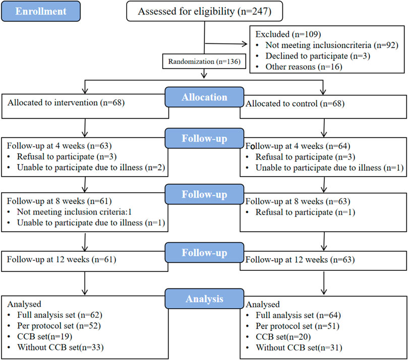 The total sample size for this study comprised 136 individuals, evenly distributed into a test group and a control group, with 68 participants in each. The primary objective of this research was to assess the recovery rate of blood pressure rhythm in both groups, both before and after treatment. Based on the preliminary examination of the participant cohort (Jiang et al., 2022), the dipper blood pressure recovery rate was observed to be 5/19 in the test group and 1/19 in the control group. Utilizing a 1:1 case ratio between the experimental and control groups, with a significance level of α = 0.05 (two-sided) and a power of β = 0.2, the required single-group sample size was calculated using PASS 11.0 software and determined to be 56 participants (N = 56). However, taking into account an anticipated dropout rate ranging from 15% to 20%, the final sample size was set at 136 individuals.