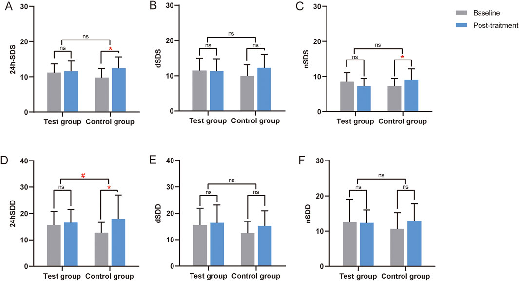 Figure 4. Changes in the SD from the ABPM of the Without CCB set. (A) Changes in 24-hour standard deviation of systolic blood pressure (24h-SDS) from the ABPM of the Without CCB set. (B) Changes in daytime standard deviation of systolic blood pressure (dSDS) from the ABPM of the Without CCB set. (C) Changes in nocturnal standard deviation of systolic blood pressure (nSDS) from the ABPM of the Without CCB set. (D) Changes in 24-hour standard deviation of diastolic blood pressure (24hSDD) from the ABPM of the Without CCB set. (E) Changes in daytime standard deviation of diastolic blood pressure (dSDD) from the ABPM of the Without CCB set. (F) Changes in nocturnal standard deviation of diastolic blood pressure (nSDD) from the ABPM of the Without CCB set. *, Compared with this group before treatment, P < 0.05. #, Compared the differences before and after treatment between the two groups, P < 0.05. CCB, calcium channel blocker. ns, non-significant.