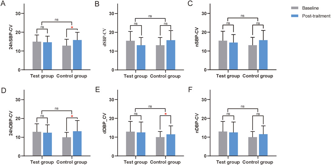 Figure 5. Changes in the CV from the ABPM of the Without CCB set. (A) Changes in 24-h coefficient of variation of systolic blood pressure (24hSBP-CV) from the ABPM of the Without CCB set. (B) Changes in daytime coefficient of variation of systolic blood pressure (dSBP-CV) from the ABPM of the Without CCB set. (C) Changes in nocturnal coefficient of variation of systolic blood pressure (nSBP-CV) from the ABPM of the Without CCB set. (D) Changes in the 24-hour coefficient of variation of diastolic blood pressure (24DBP-CV) from the ABPM of the Without CCB set. (E) Changes in daytime coefficient of variation of diastolic blood pressure (dDBP-CV) from the ABPM of the Without CCB set. (F) Changes in the nocturnal coefficient of variation of diastolic blood pressure (nDBP-CV) from the ABPM of the Without CCB set. ns, non-significant. *, Compared with this group before treatment, P < 0.05. CCB, calcium channel blockers. ns, non-significant.