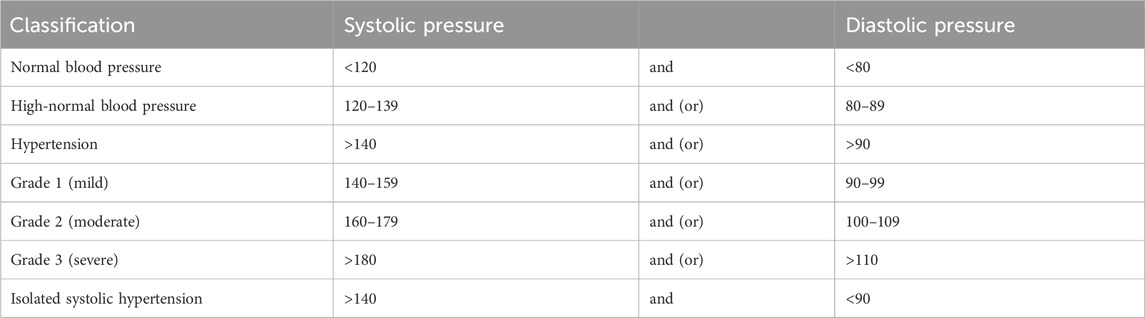 Diagnostic criteria for hypertension: Following the 2018 Chinese guidelines for the management of hypertension (Writing group of 2018 Chinese guidelines for the management of hypertension, 2019), hypertension is characterized as SBP >140 mmHg and/or DBP >90 mmHg and measured on three separate clinic visits without the influence of antihypertensive medication. Patients with a documented history of hypertension currently undergoing antihypertensive therapy should be diagnosed as hypertensive, even if their blood pressure measurements fall below 140/90 mmHg. Hypertension severity is further categorized into Grades 1, 2, and 3, depending on the degree of blood pressure elevation (Table 1).