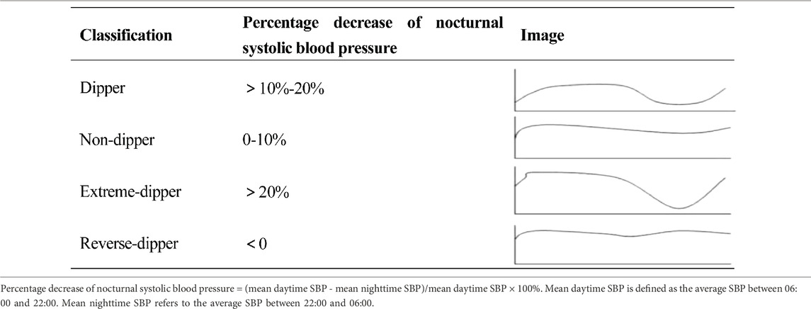 Diagnostic criteria for non-dipper blood pressure rhythms: Non-dipper blood pressure, in a narrow sense, refers to a decrease in nighttime systolic blood pressure of 0%–10%. Broadly, non-dipper blood pressure refers to all abnormal blood pressure rhythms. For the purpose of this study, we apply the broad non-dipper blood pressure rhythm criteria. The specific rhythms are defined according to the 2020 Chinese Hypertension League Guidelines on Ambulatory Blood Pressure Monitoring (Writing Group of the 2020 Chinese Hypertension League Guidelines on Ambulatory Blood Pressure Monitoring, 2021), and classified based on the percentage of nocturnal systolic blood pressure decrease (Table 2).