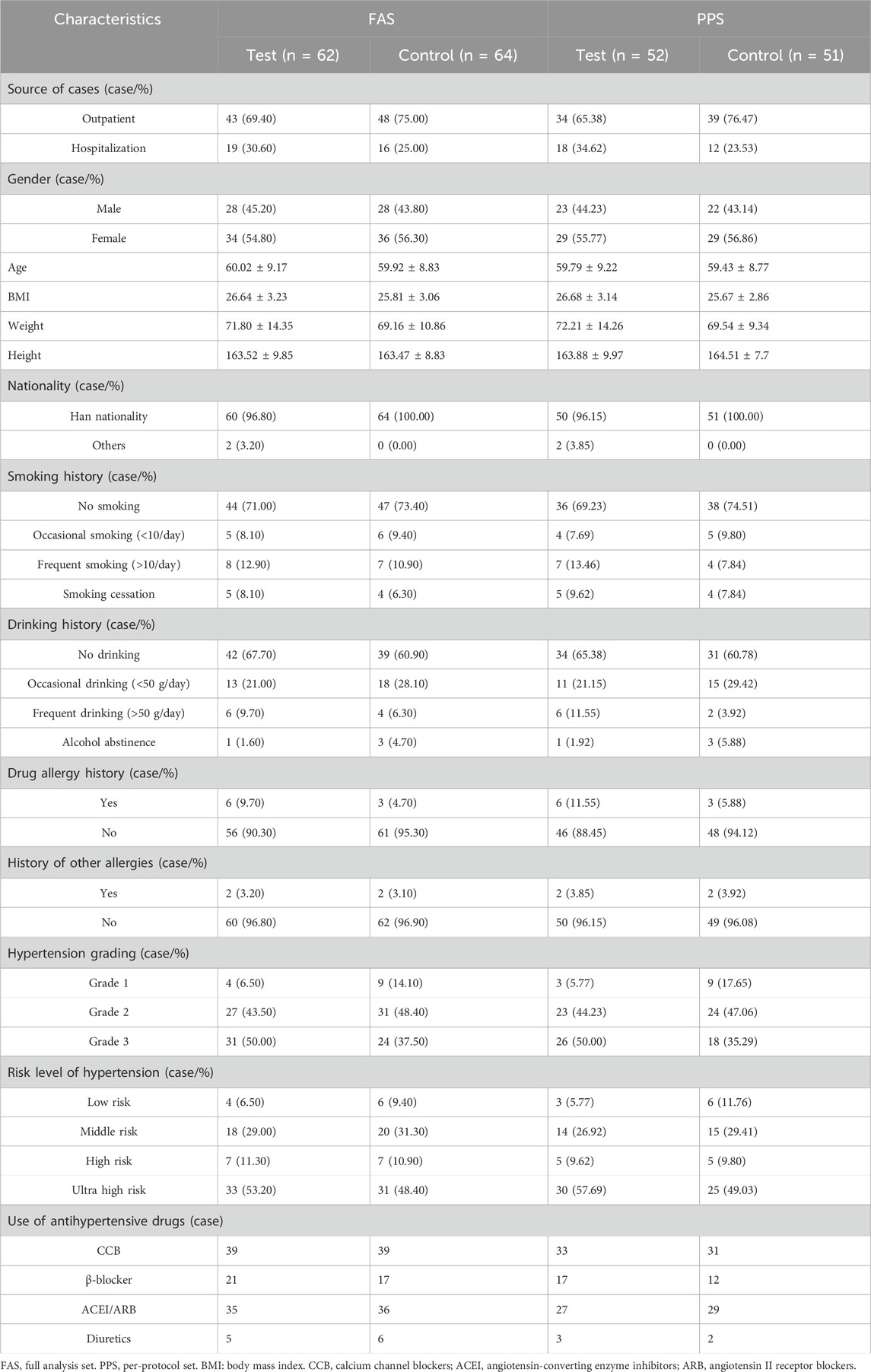 Ultimately, the full analysis set (FAS) comprised 126 participants, with 62 individuals in the test group and 64 in the control group. The test group consisted of 28 men and 34 women, with a mean age of 60.02 ± 9.17 years, while the control group included 28 males and 36 females, with a mean age of 59.92 ± 8.83 years. For the per-protocol set (PPS), the study encompassed a total of 103 participants, with 52 individuals in the test group and 51 in the control group. The test group comprised 23 men and 29 women, having an average age of 59.79 ± 9.22 years, while the control group consisted of 22 men and 29 women, with an average age of 59.43 ± 8.77 years. There were no statistically significant differences between the two groups in either the FAS or PPS (P > 0.05). Upon comparing baseline characteristics such as weight, height, body mass index (BMI), history of smoking, drinking, drug allergies, food allergies, and other allergies, as well as hypertension grading and risk level grading, no statistically significant differences were observed between the two groups, indicating their comparability (Table 3). No significant differences in baseline were noted in the CCB and Without CCB sets (Supplementary Table S3).