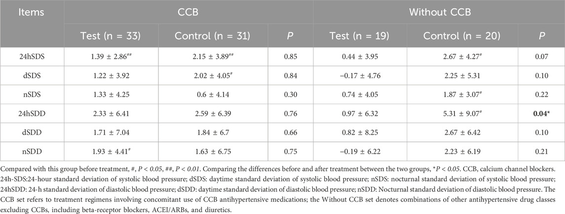 No significant differences in blood pressure SD were found between the two groups in the FAS, PPS, and CCB sets (P > 0.05) (Supplementary Table S4; Table 4). In the Without CCB set, SD regulation in the test group was better than in the control group, with a statistically significant difference noted in the 24SDD (P < 0.05) (Table 4; Figure 4).