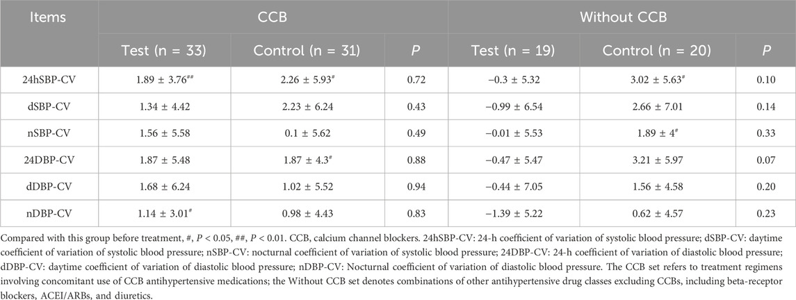 In the FAS, PPS, CCB, and Without CCB sets, no significant differences in blood pressure CV were found between the two groups (P > 0.05) (Supplementary Table S1; Table 5). However, in the Without CCB set, all CV metrics in the test group showed improvement compared to the control group (Table 5; Figure 5).