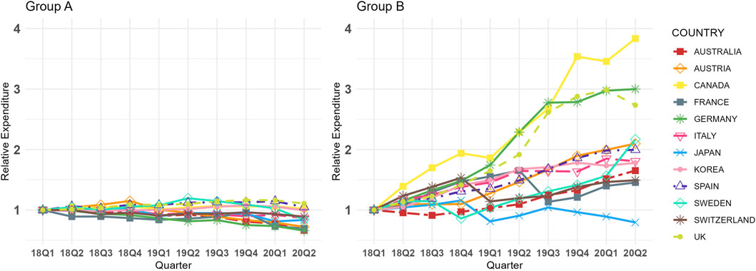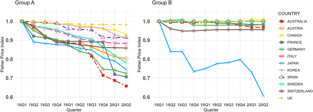 Results: Group A exhibited a declining trend in the Fisher price index, whereas Group B remained stable across most countries, with average compound quarterly growth rates being −2.19% and −0.54%, respectively (p < 0.001). Relative expenditure trends also revealed contrasting patterns between the groups across most countries, further highlighting the differences. The average compound quarterly growth rates for relative expenditures was −1.78% for Group A and 7.66% for Group B (p < 0.001).