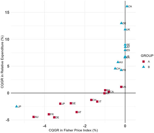 Figure 3 presents the CQGRs for the Fisher price index and relative expenditures across the two groups. The plot shows that, with the exception of Japan, most countries had a lower CQGR in Group A compared to Group B. Among the countries analyzed, Australia and France exhibited some of the lowest CQGRs in both groups, while Canada and the United Kingdom recorded some of the highest values.